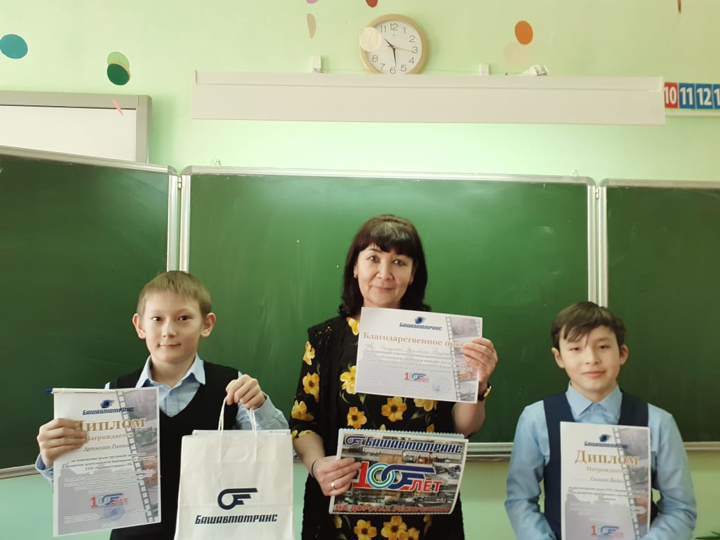 Учащиеся 4в класса Артыкаев Рамазан и Салихов Халил стали дипломантами и обладателями специального приза за участие в Открытом Республиканском творческом конкурсе эссэ и стихов, художественных работ о деятельности ГУП "Башавтотранс" РБ, посвященном 100 - летию предприятия. Учителю ребят Исчуриной Яне Даутовне вручено благодарственное письмо за организацию участия учеников. Рамазан и Халил также получили именные подарки. Молодцы! Так держать!